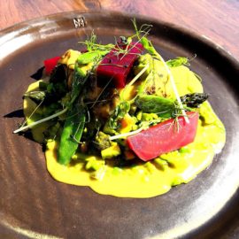 Glazované jehněčí kolínko, ragů ze zeleného chřestu a mladého hrášku, pečená řepa, omáčka z podmásl